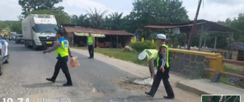 Personel Satuan Lalu Lintas Polres Labuhanbatu Selatan melaksanakan kegiatan perbaikan jalan rusak dan berlubang yang rawan kecelakaan lalu lintas (laka lantas) di Jalinsum Bedagai, tepatnya di Jembatan Titi Kembar Bedagai, Kecamatan Kotapinang, Kabupaten Labuhanbatu Selatan, Senin (23/2/2026).