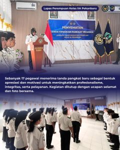Sebanyak 17 pegawai secara resmi menerima penyematan tanda pangkat baru sebagai bentuk apresiasi atas disiplin dan pengabdian dalam pelaksanaan tugas pemasyarakatan.