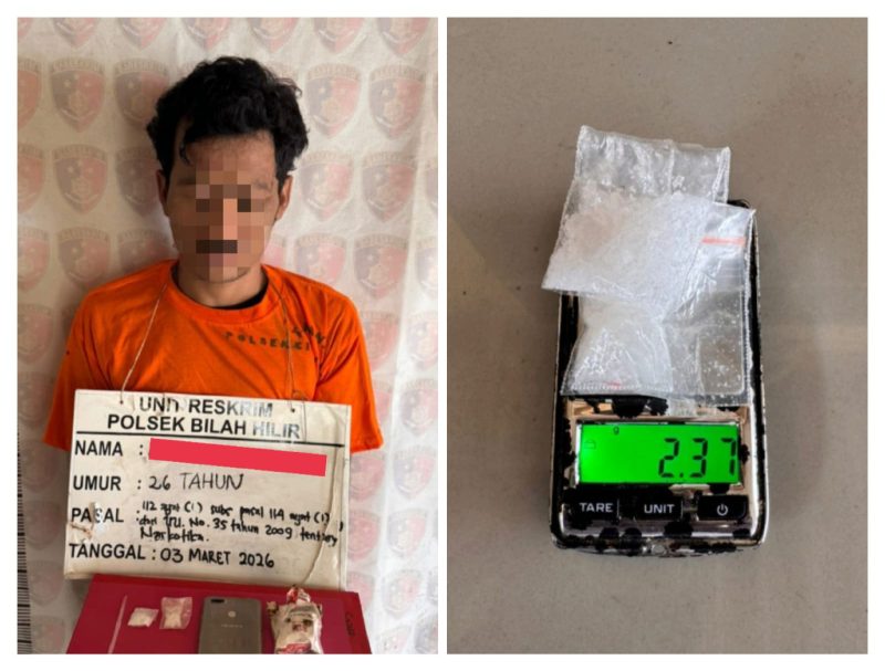 LABUHANBATU – BaraNewsSumut | Polsek Bilah Hilir melalui Unit Reskrim berhasil mengungkap kasus dugaan kepemilikan narkotika jenis sabu dengan berat bruto 2,37 gram di pinggir Jalan Lintas Lingkungan Titi Panjang Hilir, Kelurahan Negeri Lama, Kecamatan Bilah Hilir, Kabupaten Labuhanbatu.