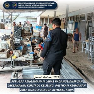 BaraNews.Com –Padangsidimpuan, Petugas pengamanan melaksanakan kegiatan kontrol keliling di seluruh area lembaga pemasyarakatan Padangsidimpuan sebagai bagian dari upaya menjaga keamanan dan ketertiban. Kegiatan tersebut meliputi pemeriksaan pada kamar hunian warga binaan, area gereja, serta bengkel kerja yang menjadi tempat pembinaan keterampilan.