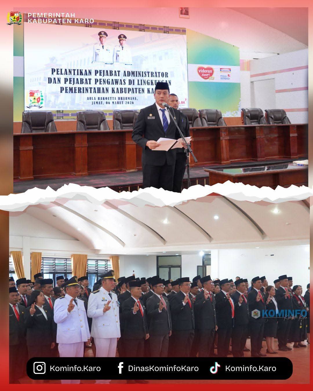 KARO – Bupati Karo, Brigjen Pol (Purn) Dr. dr. Antonius Ginting, Sp.OG., M.Kes., yang diwakilkan Sekda Kab.Karo, Gelora Kurnia Putra Ginting, S.STP., MM., melantik dan mengambil sumpah/janji jabatan sebanyak 160 pejabat administrator dan pengawas di lingkungan Pemerintah Kabupaten Karo pada Jumat di Aula Kantor Bupati Karo. Pelantikan tersebut terdiri dari 43 pejabat eselon III (administrator) dan 117 pejabat eselon IV (pengawas).