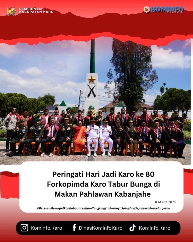Baranews.com | Dalam rangka memperingati Hari Jadi Kabupaten Karo ke-80, Bupati Karo, Brigjen.Pol.(Purn).Dr.dr.Antonius Ginting,Sp.OG,M.Kes dan Forkopimda melaksanakan upacara tabur bunga di Makam Pahlawan Kabanjahe. Minggu, (08/03/2026)