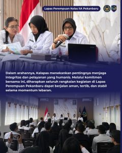 Melalui rapat ini diharapkan seluruh jajaran Lapas Perempuan Pekanbaru memiliki komitmen yang sama dalam menjaga stabilitas keamanan serta memberikan pelayanan terbaik selama pelaksanaan Hari Raya Idul Fitri di lingkungan Lapas, Tegasnya.