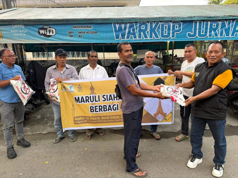 Anggota DPR RI Komisi XIII Fraksi Golkar Daerah Pemilihan Sumatera Utara I Kombes Pol. (Purn.) Dr Maruli Siahaan,SH., MH., memberikan bantuan Tali Kasih dan puluhan karung beras kepada sejumlah wartawan yang ada di Kota Medan, Rabu 18 Maret 2026.