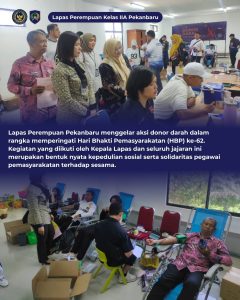 BaraNews.Com-Dalam rangka memperingati Hari Bhakti Pemasyarakatan (HBP) ke-62, Lapas Perempuan Pekanbaru turut berpartisipasi dalam kegiatan donor darah yang diselenggarakan oleh Kantor Wilayah Direktorat Jenderal Pemasyarakatan.