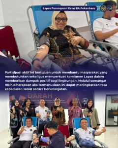 Kegiatan ini diikuti langsung oleh Kepala Lapas Perempuan Pekanbaru beserta jajaran pegawai sebagai bentuk kepedulian sosial dan kontribusi nyata kepada masyarakat. Donor darah menjadi salah satu rangkaian kegiatan HBP yang bertujuan untuk meningkatkan rasa kemanusiaan serta solidaritas antar sesama.