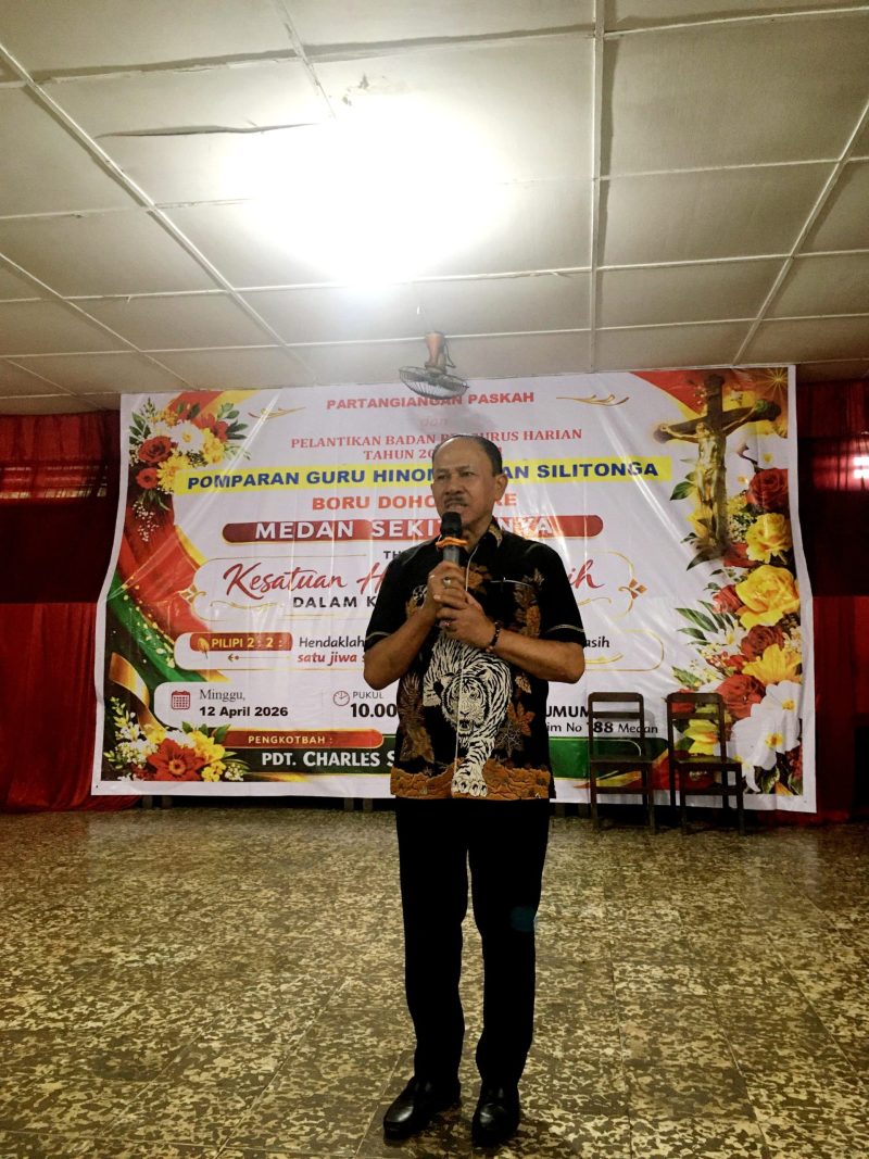 Kombes Pol. (Purn.) Dr. Maruli Siahaan, SH., MH., selaku Anggota Dewan Perwakilan Rakyat Republik Indonesia (DPR RI) Komisi XIII dari Daerah Pemilihan Sumatera Utara I, menghadiri kegiatan Ibadah Paskah sekaligus Pelantikan Badan Pengurus Harian (BPH) Tahun 2026–2031 Pomparan Guru Hinombingan Silitonga Boru Dohot Bere Medan Sekitarnya, Minggu 12 April 2026. Kegiatan tersebut dilaksanakan di Wisma Umum dengan dihadiri ratusan undangan dari berbagai kalangan.