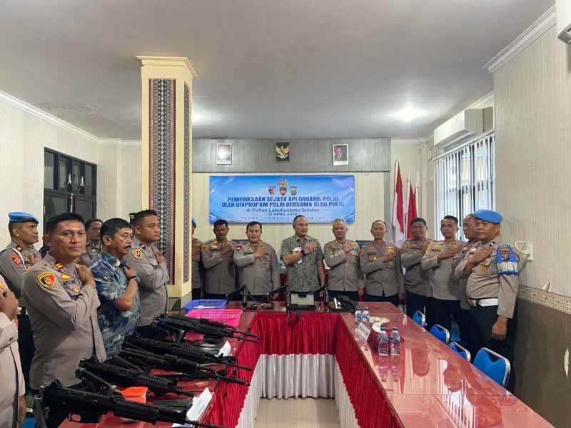 Pemeriksaan senjata api (senpi) organik Polri dilakukan oleh Divisi Profesi dan Pengamanan (Propam) Mabes Polri bersama Slog Mabes Polri di Aula Polres Labuhanbatu Selatan, Jumat (17/4/2026).