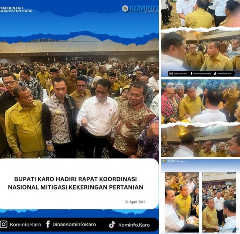 Baranews.com | Bupati Karo, Brigjen Pol (Purn) Dr. dr. Antonius Ginting, Sp.OG, M.Kes., menghadiri Rapat Koordinasi Nasional (Rakornas) terkait mitigasi kekeringan lahan pertanian yang diselenggarakan oleh Kementerian Pertanian Republik Indonesia di Auditorium Gedung F, Kantor Pusat Kementerian Pertanian, Jakarta Selatan, Senin (20/04/2026).