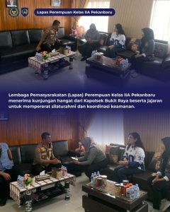 Kedatangan Kapolsek Bukit Raya beserta jajaran disambut langsung oleh Kepala Lapas Perempuan Kelas IIA Pekanbaru. Suasana hangat dan penuh kebersamaan mewarnai pertemuan tersebut, yang bertujuan menciptakan lingkungan pemasyarakatan yang aman, tertib, dan kondusif.